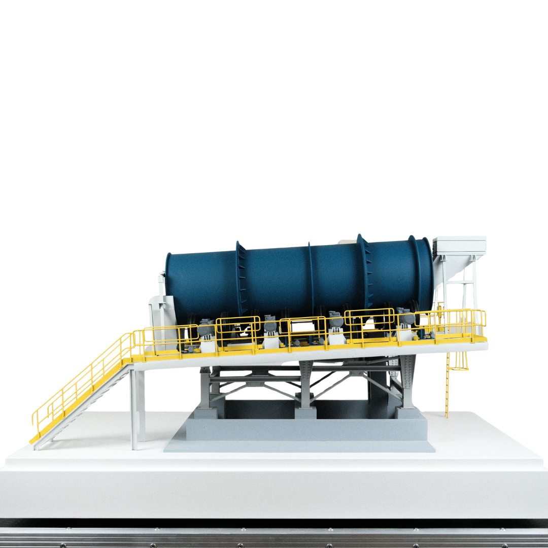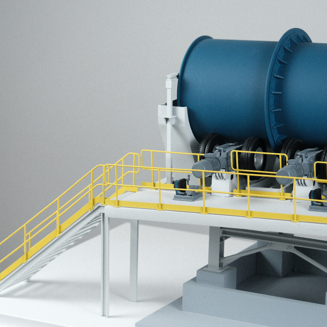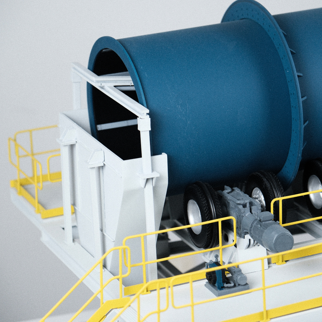 Dettagli industriali in miniatura: Il tamburo dell’agglomeratore, il meccanismo di alimentazione, le linee di scarico e le strutture di supporto sono modellati con alta precisione.