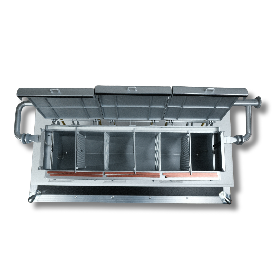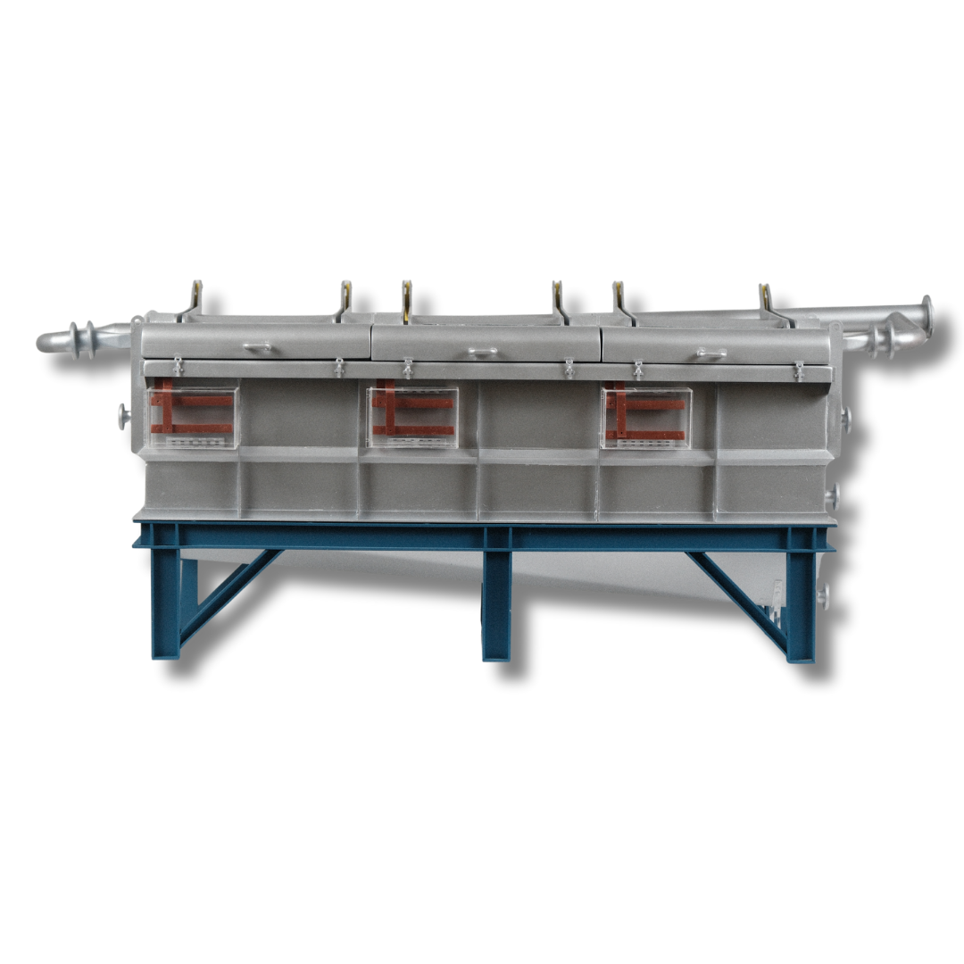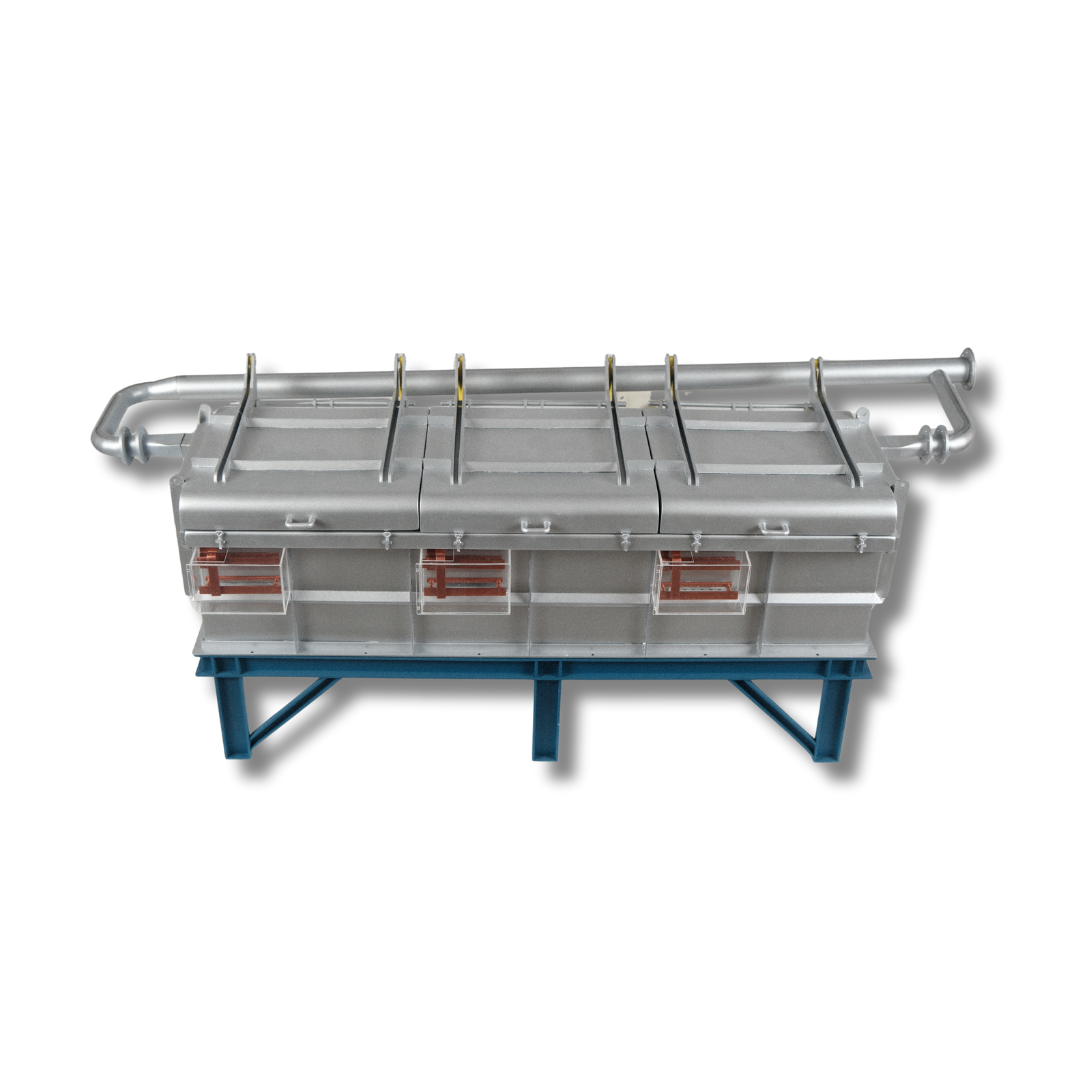 Il modello in scala della cella di elettrolisi CH è stato progettato e realizzato da ARI Model per CH Consultants. Le celle di elettrolisi sono fondamentali per la purificazione dei metalli preziosi come oro, argento e rame nell’industria mineraria e metallurgica. Questa tecnologia avanzata è riprodotta fedelmente in ogni dettaglio del modello.